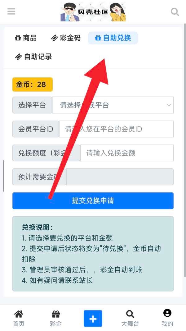 在个人中心点击查看金币,然后在APP栏找到彩金 自助兑换【选择对应的平台进行兑换彩金 注:需要在社区注册的平台才能 要不然没办法派送】